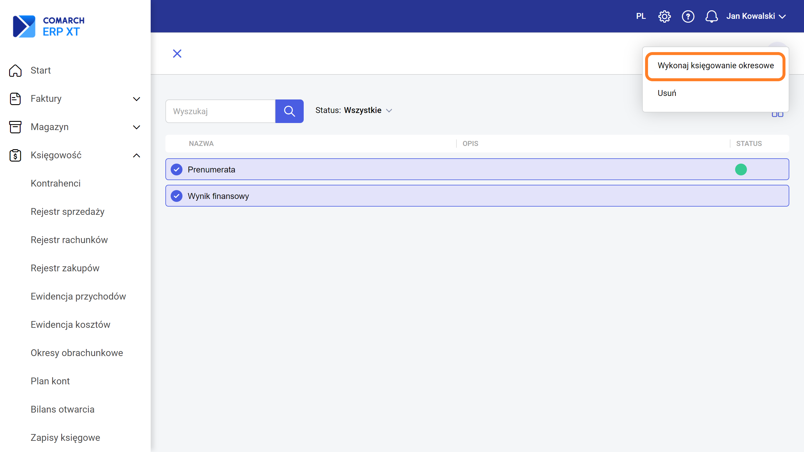 Na liście Księgowania okresowe należy zaznaczyć księgowanie okresowe, które chcemy wykonać, a następnie z menu kontekstowego należy wybrać opcję ‘Wykonaj księgowanie okresowe’.