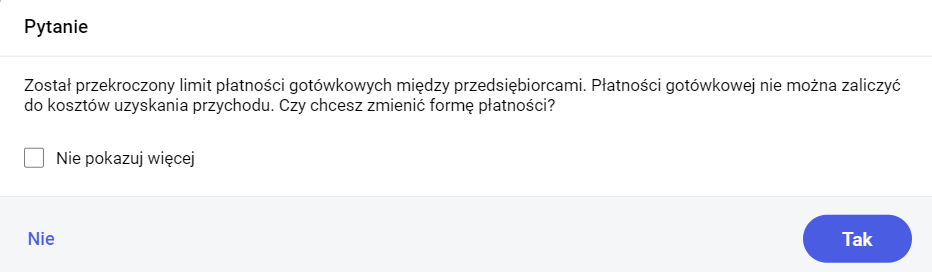 „Został przekroczony limit płatności gotówkowych między przedsiębiorcami. Płatności gotówkowej nie można zaliczyć do kosztów uzyskania przychodu. Czy chcesz zmienić formę płatności?” W przypadku transakcji sprzedaży istnieje możliwość zaznaczenia parametru „Nie pokazuj więcej”.