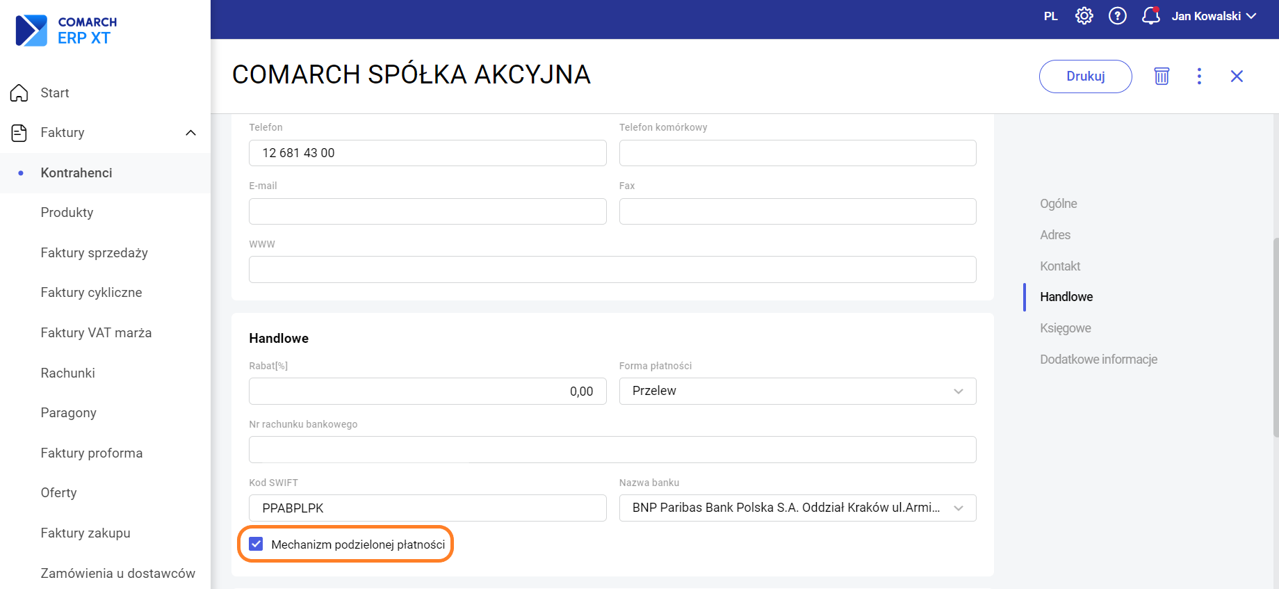 Na karcie kontrahenta dotychczas istniejący parametr ‘Stosuj split payment’ został zastąpiony parametrem ‘Mechanizm podzielonej płatności’.