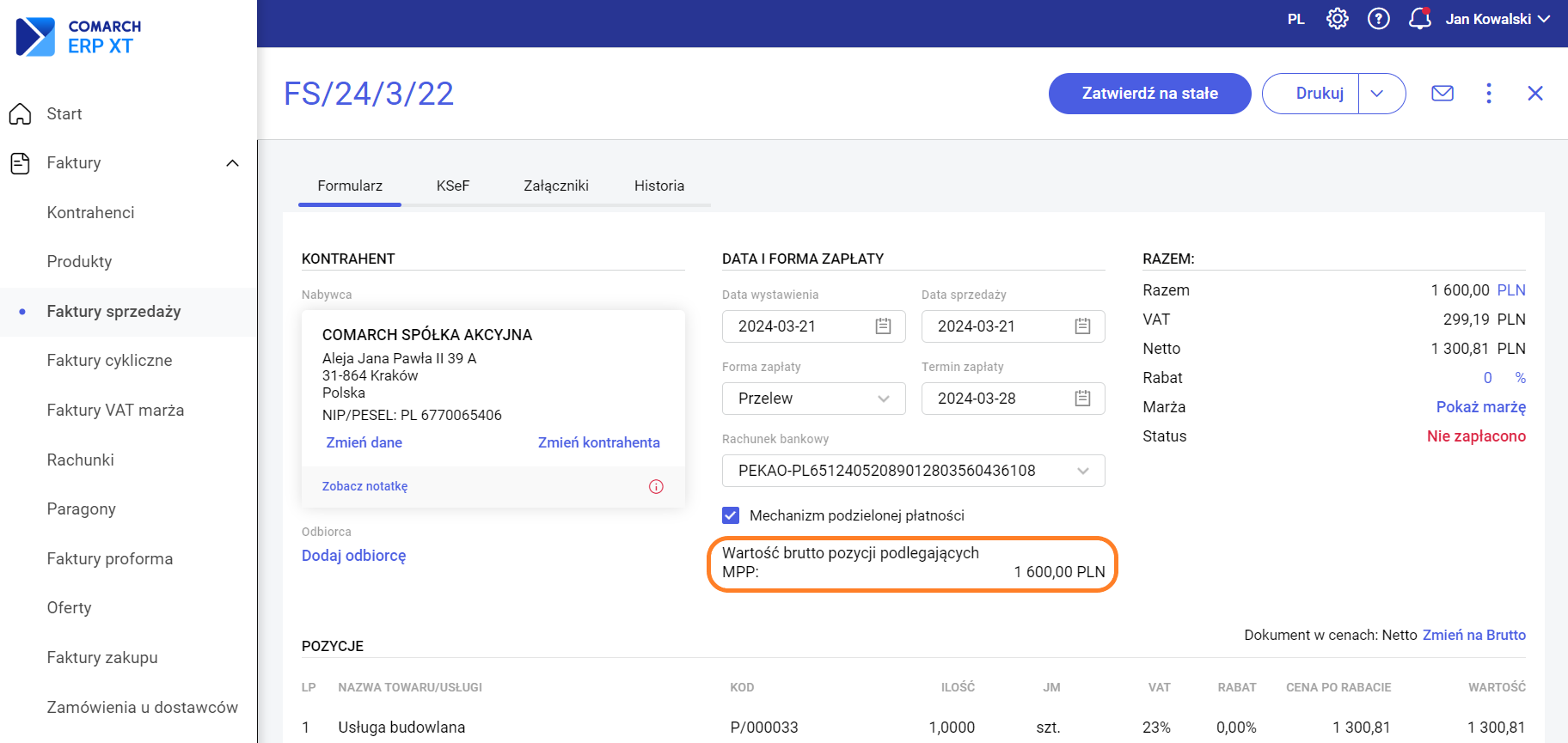 Dla Faktur Sprzedaży, Faktur Zaliczkowych, Faktur proforma, Faktur Zakupu oraz korekt do tych dokumentów, na formularzu dokumentu znajduje się parametr MPP – umożliwiający rozliczenie faktury za pomocą mechanizmu podzielonej płatności.
