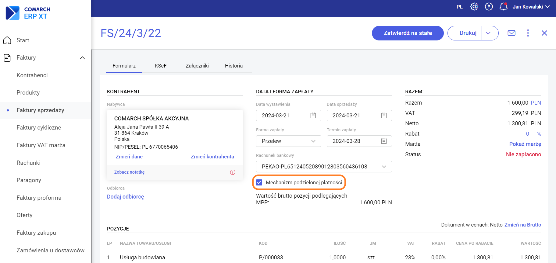 - na dokumencie wybrany jest kontrahent, który na karcie ma zaznaczony parametr Mechanizm podzielonej płatności,