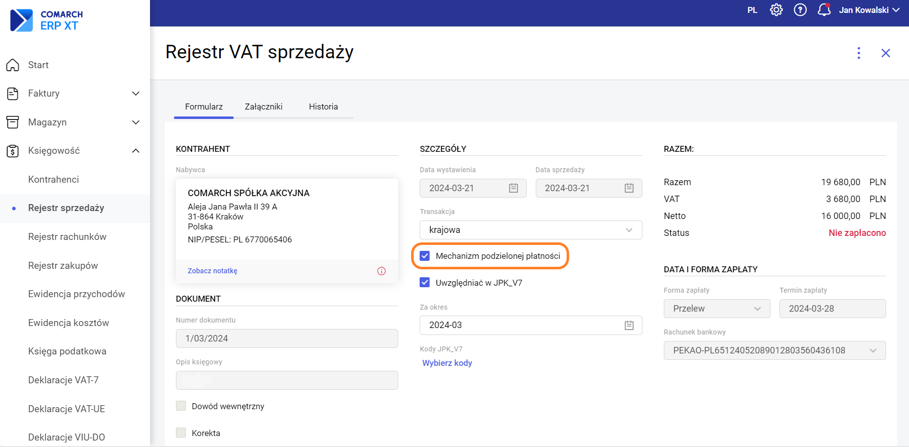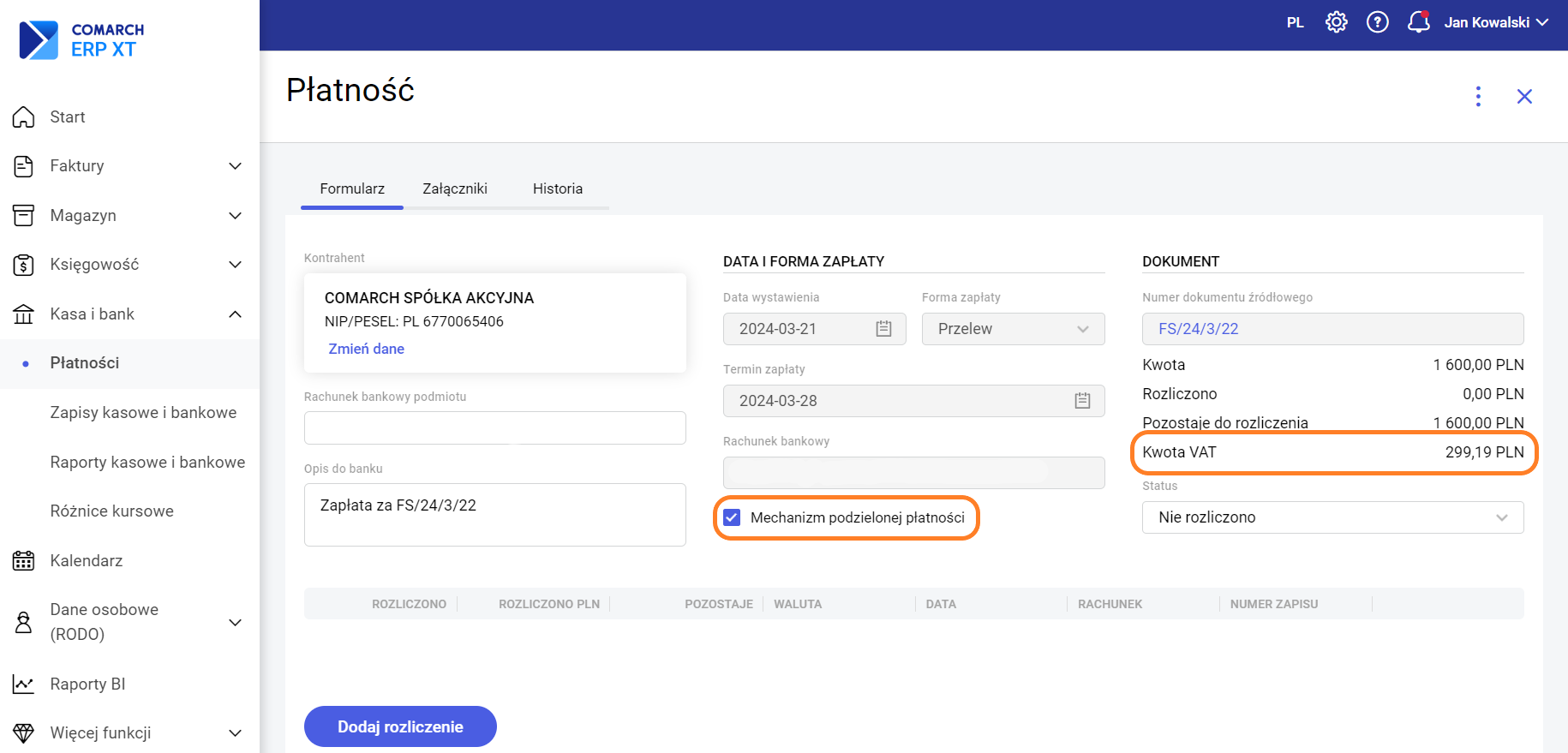 Faktury, które podlegają mechanizmowi podzielonej płatności muszą mieć zaznaczony parametr Mechanizm podzielonej płatności. Płatności do takich dokumentów mają na formularzu płatności zaznaczony parametr Mechanizm podzielonej płatności oraz wyodrębnioną kwotę podatku VAT.