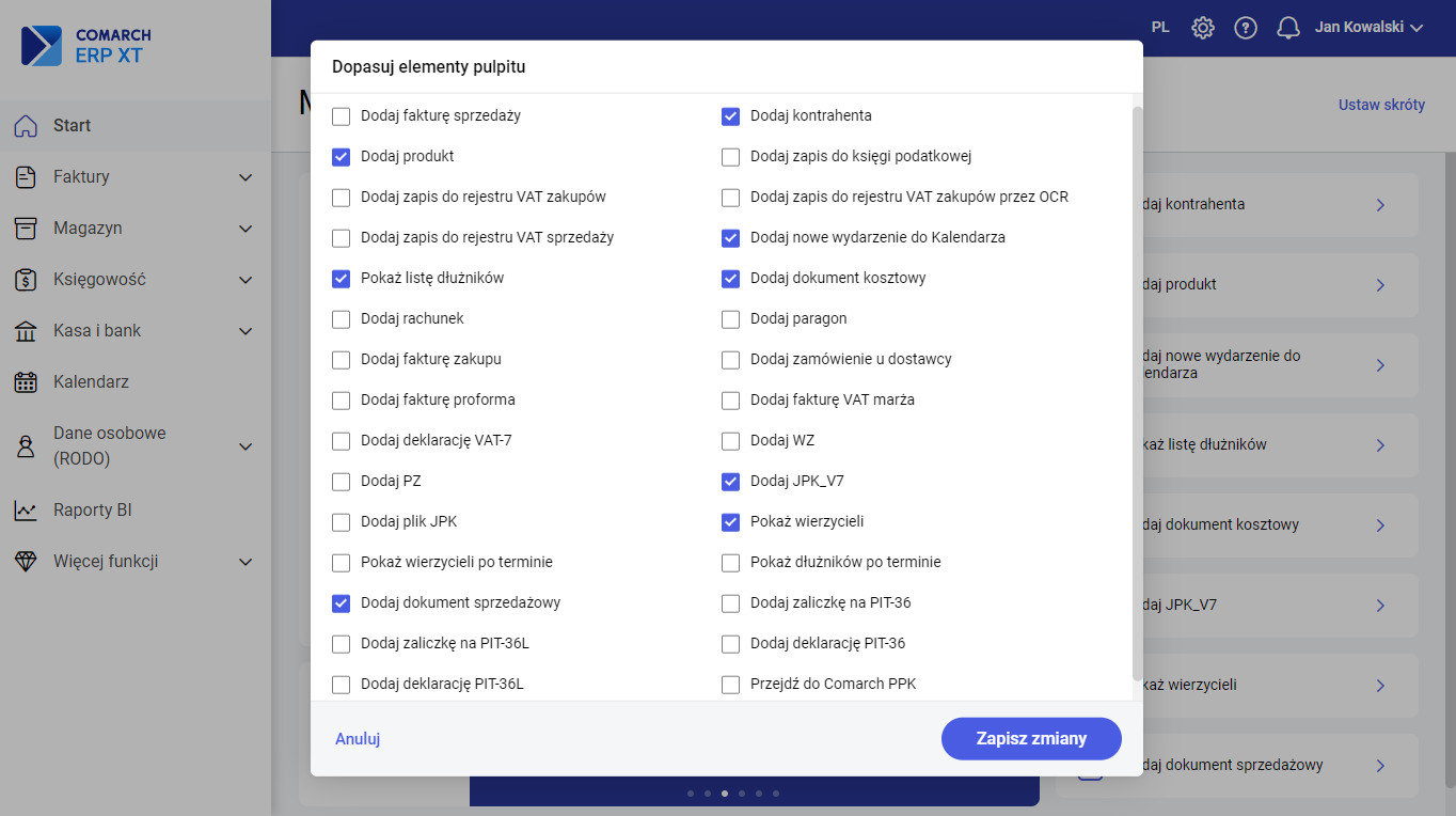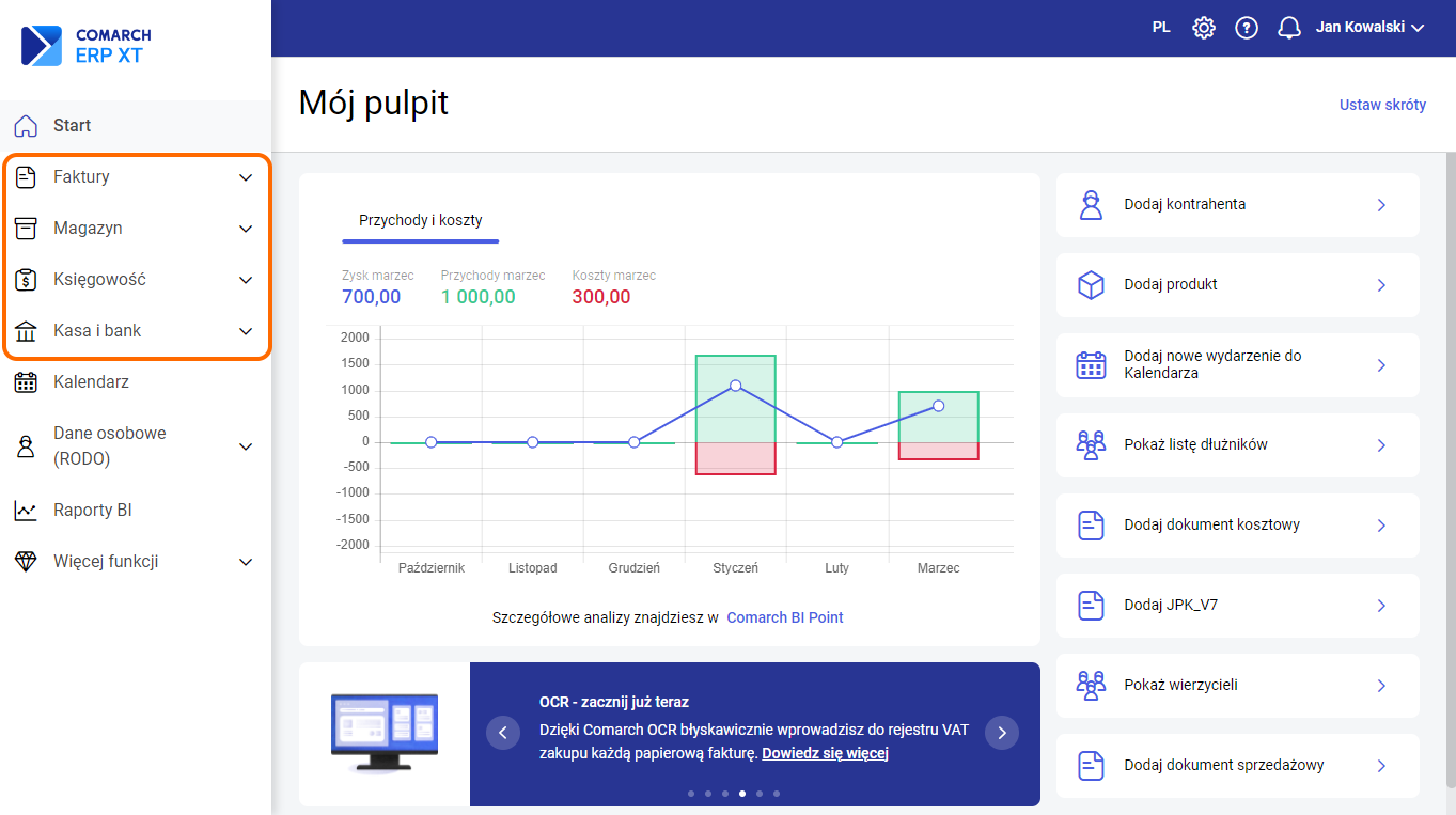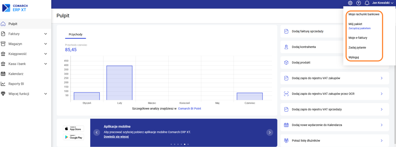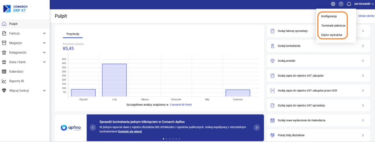 Bezpośrednio po zalogowaniu Użytkownik widzi pulpit, na którym widoczny jest wykres przedstawiający analizę przychodów i kosztów w przedziale miesięcznym w ciągu ostatnich 6 miesięcy: Ponadto na oknie można zdefiniować zestaw przycisków umożliwiających szybki dostęp do funkcji w programie. Na wyświetlonym oknie wskazujemy przyciski, które powinny być widoczne: Z lewej strony znajduje się menu, za pomocą którego Użytkownik ma dostęp do poszczególnych list merytorycznych. Są one pogrupowane w cztery listy Faktury, Magazyn, Księgowość, Kasa i Bank. Faktury – grupa, w której zgromadzone są listy słownikowe dokumentów handlowych: Magazyn– grupa, w której zgromadzone są listy słownikowe dokumentów magazynowych: Księgowość – grupa, w której zgromadzone są listy słownikowe wspólne i księgowe: Dodatkowo w menu można znaleźć: W górnej belce możliwy jest dostęp do ustawień konfiguracyjnych. Konto zawiera funkcje: Konfiguracja daje dostęp do funkcji związanych z szeroko pojętą pracą w programie. Dodatkowo z tego poziomu można skonfigurować Terminale płatnicze oraz przejść do Edytora wydruków. Konfiguracja składa się z sekcji: Zobacz także: