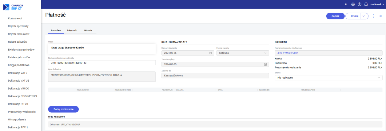 Płatności dla deklaracji i zaliczek mają odpowiednio numery zaczynające się od „JPK_V7” lub „PIT-36”. Na formularz takiej płatności, jako podmiot jest przenoszony wybrany na dokumencie Urząd Skarbowy. Do płatności podstawiany jest także Indywidualny rachunek podatkowy oraz zgodny ze standardem opis, którego nie można edytować. Przelewy dla deklaracji i zaliczek można drukować i eksportować za pomocą formatu ELIXIR korzystając z ikon w prawym górnym rogu.