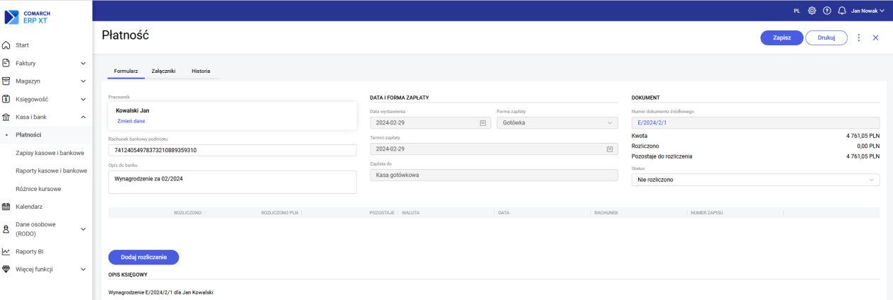 Płatności dla wynagrodzeń mają nazwy rozpoczynające się od liter I lub E w zależności od typu wypłaty (etat lub inne). W pola Podmiot i Rachunek bankowy podstawiane są dane z karty pracownika. Opis wskazuje na okres za który naliczane jest wynagrodzenie, ale można go modyfikować.