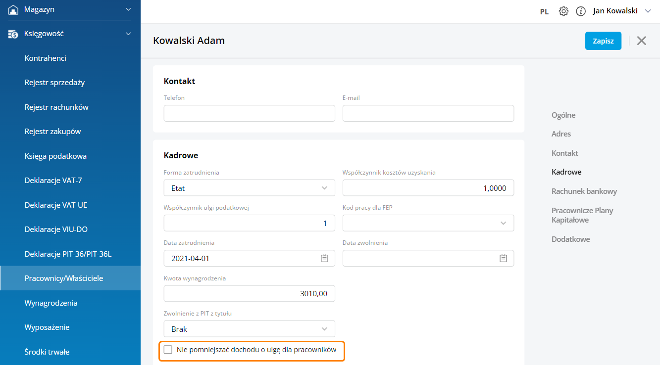 Na formularzu pracownika, dodano nowy parametr ‘Nie pomniejszać dochodu o ulgę dla pracowników’, który należy zaznaczyć w przypadku złożenia wniosku przez pracownika. Pracownik może złożyć pracodawcy pisemny wniosek o niepomniejszanie dochodu o kwotę ulgi.