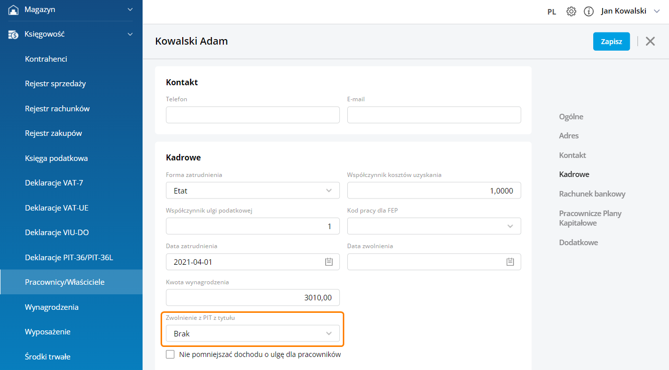 Pole ‘Zwolnienie z PIT z tytułu’ zastąpiło dotychczasowy parametr 'Zwolnienie z PIT dla młodych’. Podczas dodawania nowego pracownika domyślnie będzie ustawiona opcja ‘brak’. Po udostępnieniu nowej wersji programu, jeśli pracownik miał zaznaczony parametr ‘Zwolnienie z PIT dla młodych’ to w nowym polu ‘Zwolnienie z PIT z tytułu’ automatycznie ustawi się opcja ‘Osoba do 26 lat’. W przypadku zwolnienia z innych tytułów ustawienia będzie dokonywał Użytkownik, gdyż przysługują one po złożeniu odpowiedniego wniosku przez pracownika.