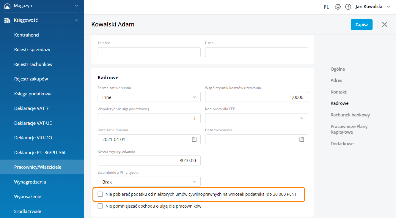 • Na karcie pracownika zaznaczamy parametr ‘Nie pobierać podatku od niektórych umów cywilnoprawnych na wniosek podatnika (do 30 000 PLN)’