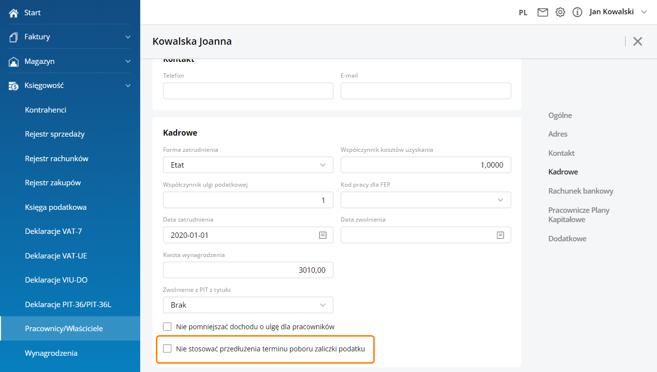Na formularzu pracownika w sekcji Kadrowe został dodany nowy parametr (domyślnie niezaznaczony) ‘Nie stosować przedłużenia terminu poboru zaliczki podatku’. W przypadku gdy parametr jest zaznaczony zaliczka podatku naliczana jest według zasad obowiązujących od 1.01.2022 r. bez stosowania rozporządzenia.