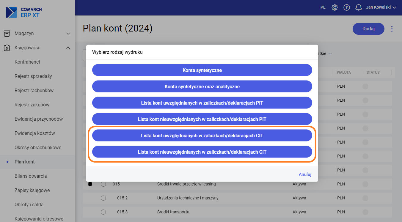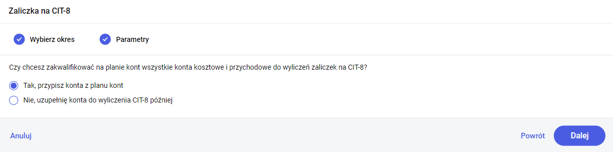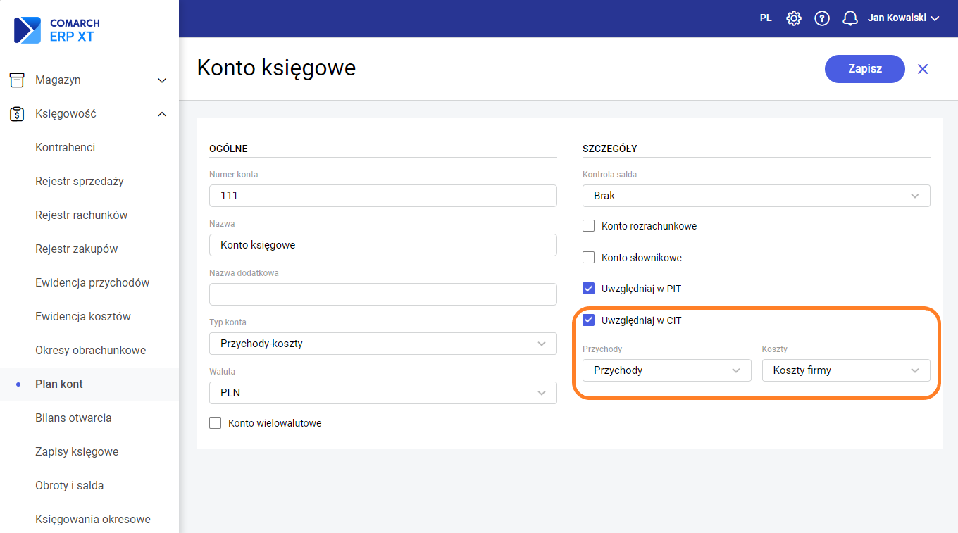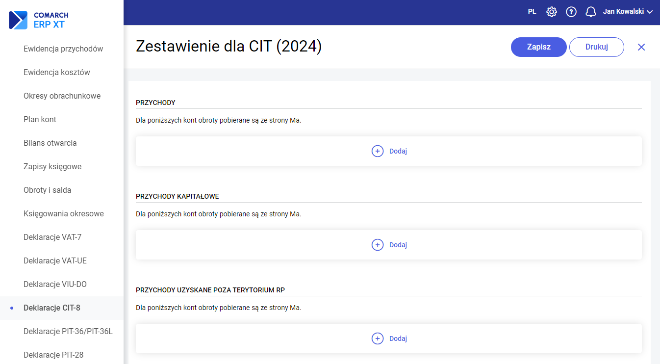 Ustawienie parametrów do zaliczki na CIT-8 jest również możliwe na kreatorze okresu obrachunkowego w etapie 3. Zaliczki i Deklaracje: Zaliczki CIT-8 są dostępne w menu Księgowość – Deklaracje CIT-8. Kwoty przychodów i kosztów pobierane są automatycznie przez program księgowy z zapisów księgowych, na których zostały wybrane konta wskazane na liście Zestawienie dla CIT. Lista jest dostępna na liście Zaliczki i deklaracje roczne CIT-8 w menu kontekstowym. Po wybraniu opcji Zestawienie dla CIT pojawi się okno, na którym należy wybrać konta, z których kwoty mają być pobierane. Kwoty przychodów będą wyliczane na podstawie wartości zaksięgowanych po stronie Ma (Ct) kont wskazanych w Zestawieniu dla CIT w sekcji: Przychody, Przychody Kapitałowe, Przychody uzyskane poza terytorium RP oraz Przychody kapitałowe uzyskane poza terytorium RP. Kwoty kosztów będą wyliczane na podstawie wartości zaksięgowanych po stronie Wn (Dt) kont wskazanych w Zestawieniu w sekcji Koszty firmy, Koszty kapitałowe firmy, Koszty firmy poza terytorium RP oraz Koszty kapitałowe poza terytorium RP. Domyślnie konta łączone są ze sobą znakiem „+” (sumowanie), ale istnieje możliwość zmiany znaku na „-” (różnica). W kreatorze okresu obrachunkowego istnieje możliwość przypisania domyślnych kont do Zestawienia dla CIT w oparciu o utworzony automatycznie wzorcowy plan kont dla danego rodzaju firmy, typu działalności oraz zespołu kont kosztowych. Jeżeli okres obrachunkowy został już utworzony to przypisanie domyślnych kont do Zestawienia dla CIT jest możliwe podczas wyliczania pierwszej zaliczki CIT-8. Konta przypisane na Zestawieniu dla CIT są pamiętane w kontekście okresu obrachunkowego. Przy tworzeniu kolejnego okresu obrachunkowego i kopiowaniu ustawień kopiowane są również konta wprowadzone na Zestawieniu dla CIT. Dodatkowo, istnieje możliwość przypisania konta do Zestawienia dla CIT bezpośrednio z formularza konta w Planie kont. Dla kont o typie: Przychody, Koszty, Przychody-koszty, Pozabilansowe na formularzu konta dostępny jest parametr Uwzględniaj w CIT. Zaznaczenie parametru spowoduje dopisanie konta do Zestawienia do sekcji Przychody i/lub Koszty w zależności od typu konta. W celach weryfikacyjnych, na Planie kont dostępne są wydruki w menu kontekstowym: Lista kont uwzględnianych w zaliczkach/deklaracjach CIT, Lista kont nieuwzględnianych w zaliczkach/deklaracjach CIT. Na wydrukach prezentowane są konta o typach: Przychody, Koszty, Przychody-koszty, Pozabilansowe, które zostały adekwatnie uwzględnione lub nieuwzględnione na Zestawieniu dla CIT. Zobacz więcej: