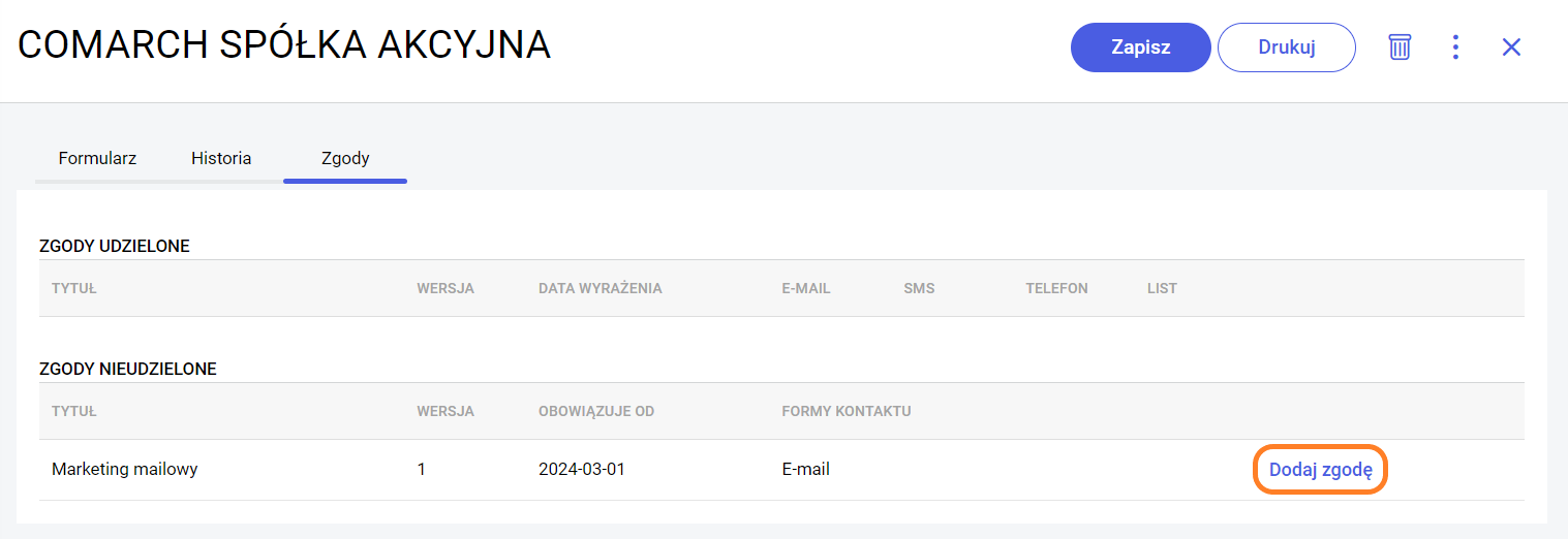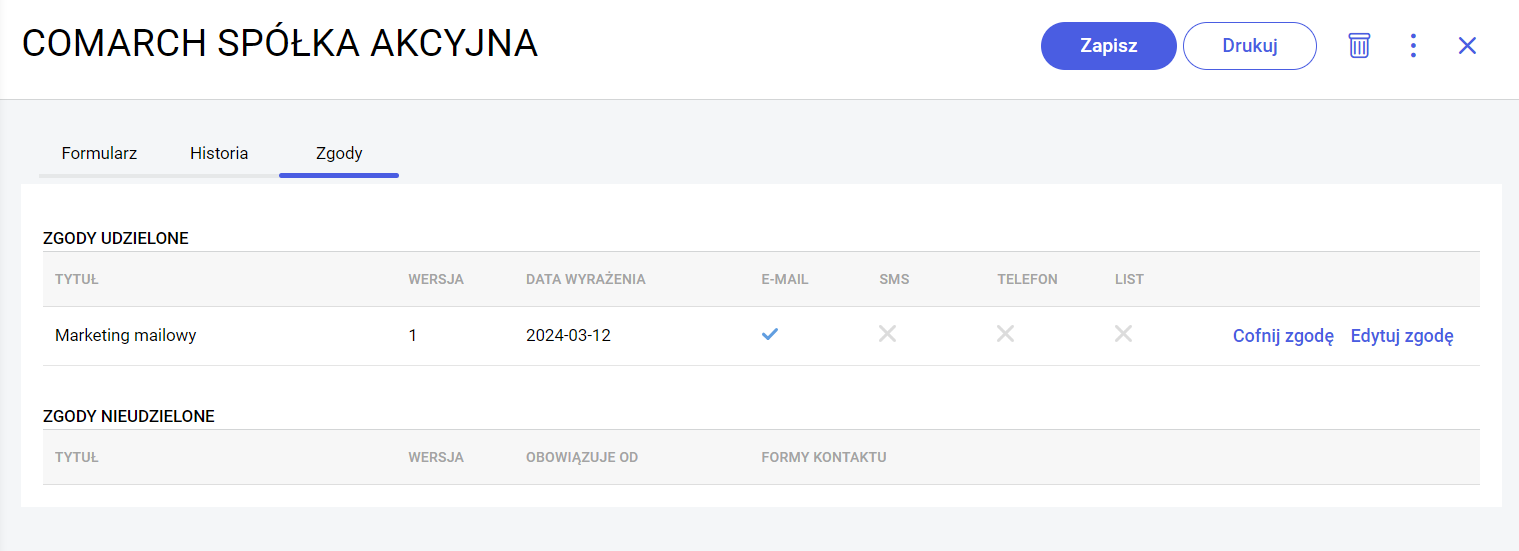 Uwaga! Po wybraniu właściwych zgód na formularzu kontrahenta należy zapisać zmiany poprzez wybór opcji Zapisz.