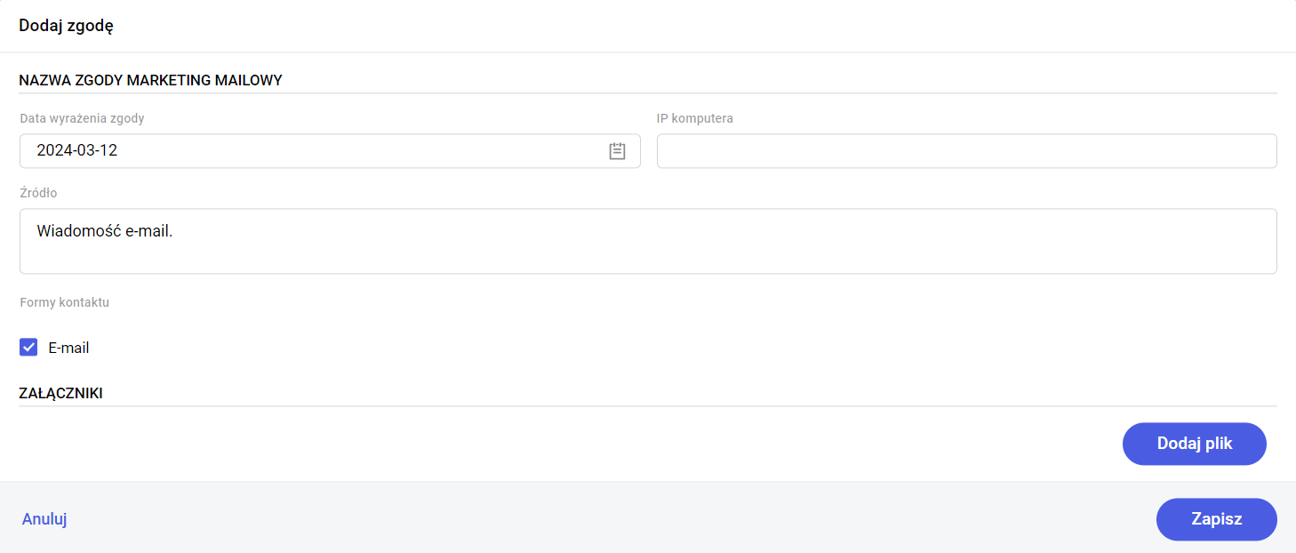 uzupełniamy Datę wyrażenia zgody oraz Źródło. Dodatkowo w przypadku zgody marketingowej należy wybrać również wskazaną przez kontrahenta formę kontaktu. Pole IP komputera jest wypełnianie automatycznie. Po zapisaniu dodawania zgody, taka zgoda będzie widoczna na kontrahencie w sekcji zgody udzielone