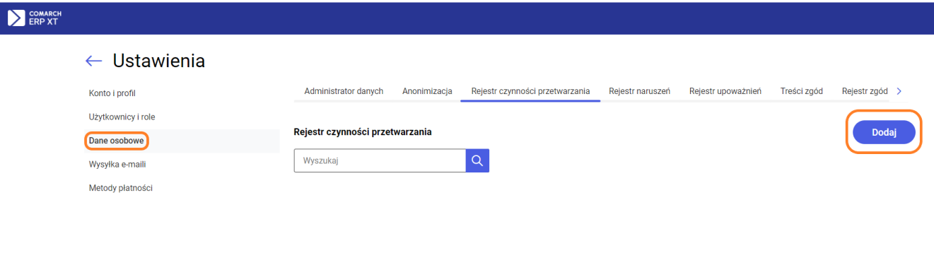 Lista Rejestr czynności przetwarzania umożliwia ewidencjonowanie, w jakich procesach w naszej firmie przetwarzane są dane osobowe, w jakim celu i kogo dotyczą. Lista jest dostępna w Konfiguracji/ Dane osobowe na zakładce Rejestr czynności przetwarzania. Dodanie nowej odbywa się za pomocą przycisku Dodaj.