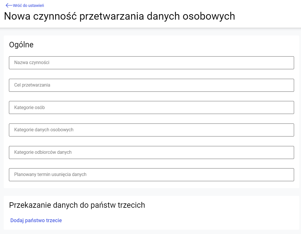 Przynajmniej jedno z tych pól musi być uzupełnione aby zapis czynności był możliwy. Jeżeli dane osobowe będą przekazywane państwom trzecim, poniżej mamy możliwość wpisania takiej informacji wraz z uzasadnieniem.