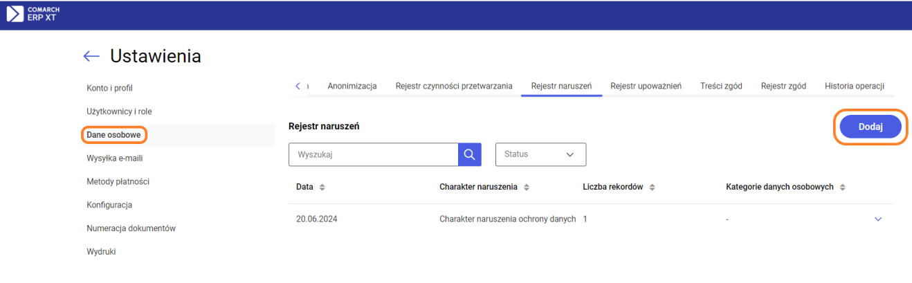 Rejestr naruszeń umożliwia ewidencjonowanie przypadków naruszenia ochrony danych osobowych. Administrator ma obowiązek udokumentować wszystkie takie naruszenia wraz z okolicznościami naruszenia, jego skutkami oraz podjętymi działaniami zaradczymi. Rejestr ma formę tabeli na której widoczne są data i charakter naruszenia, liczba rekordów i osób dotkniętych naruszeniem, dane inspektora oraz informacja czy naruszenie zostało zgłoszone do GIODO.