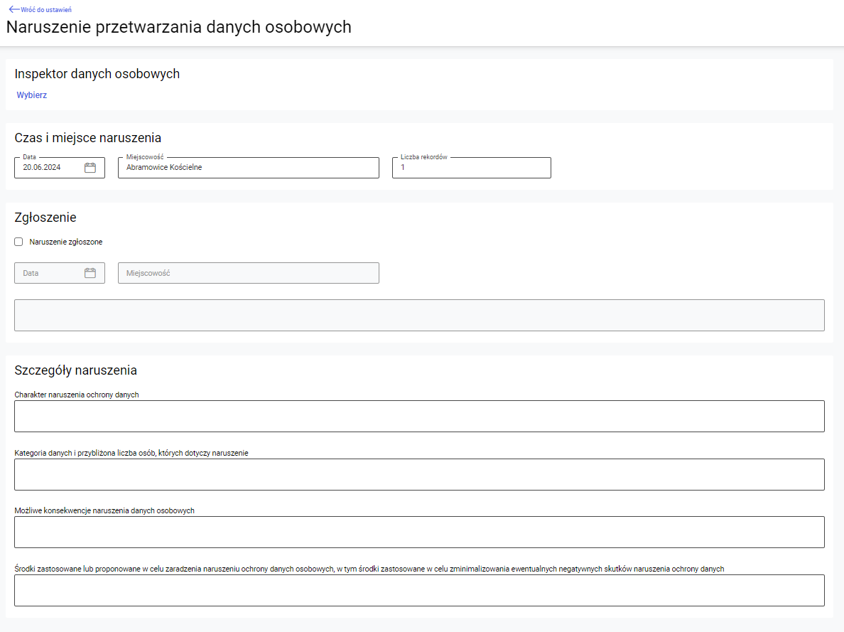 Poniżej, w sekcji Szczegóły naruszenia, mamy dostępne pola tekstowe przeznaczone do opisania: