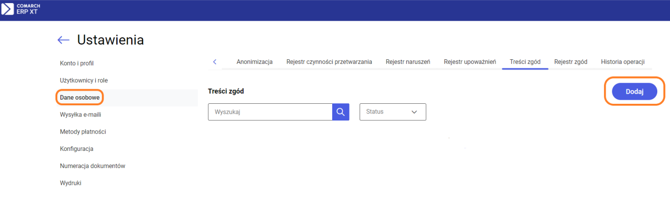 Po wybraniu Dodaj pojawi się formularz nowej zgody.