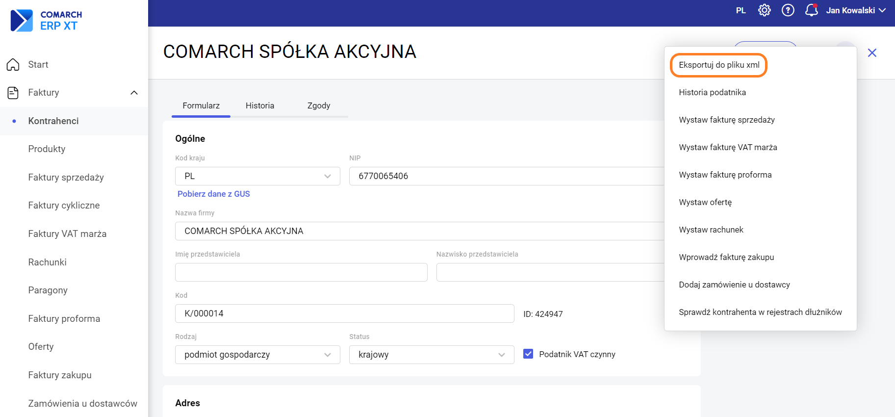 Dodatkowo z poziomu karty kontrahenta można wyeksportować dane do pliku xml wybierając Eksportuj do pliku xml.