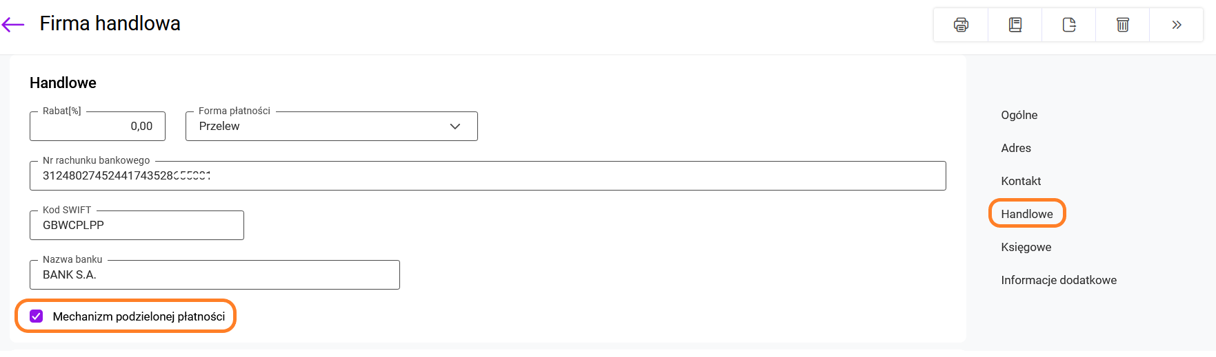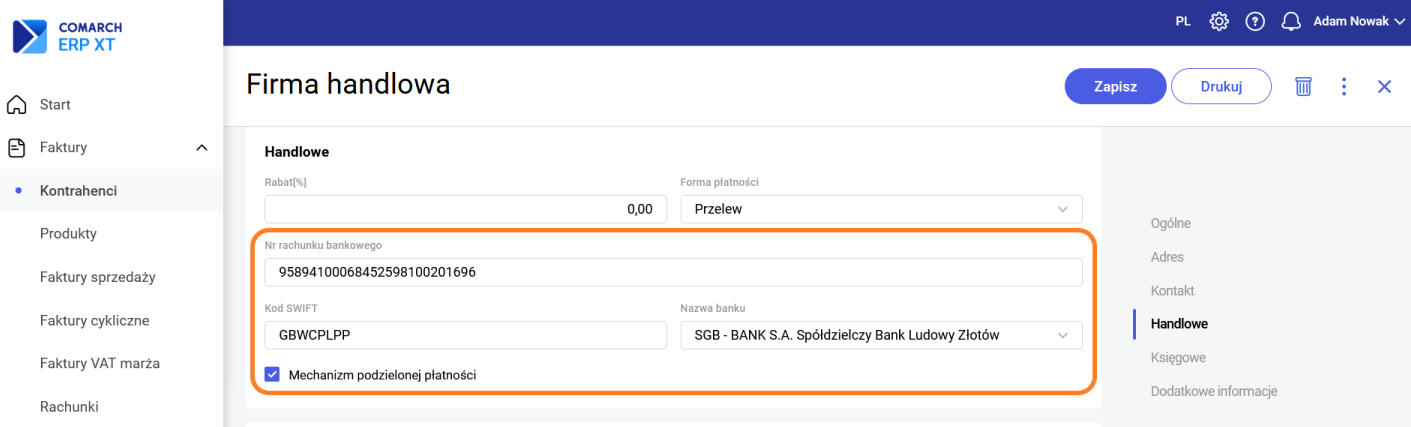 Przelew w postaci Split payment można wykonywać dla każdego dokumentu. Aby możliwe było wyeksportowanie przelewu niezbędne jest uzupełnienie rachunku bankowego na karcie kontrahenta. Jeżeli zaznaczymy parametr Mechanizm podzielonej płatności na karcie kontrahenta to będzie on automatycznie przenosił się na płatności.