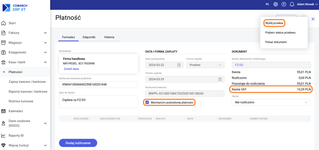 W przypadku zaznaczonego parametru Mechanizm podzielonej płatności na formularzu płatności pojawia się dodatkowa pozycja Kwota VAT. Dla płatności rozchodowych jest również możliwość eksportu przelewu za pomocą formatu Elixir.