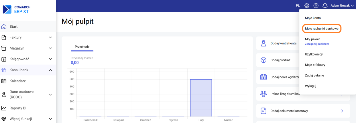 Aby wprowadzić do programu własny rachunek VAT należy kliknąć nazwę konta w prawym górnym rogu i wybrać Moje rachunki bankowe.