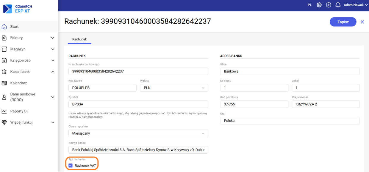 Następnie należy kliknąć Dodaj. W otwartym oknie należy wpisać dane rachunku VAT i zaznaczyć parametr Rachunek VAT. Parametr ten można zaznaczyć tylko dla rachunków w walucie polskiej, nie będzie można wskazać go na dokumentach i zapłatach, ale można tworzyć dla niego raporty i zapisy kasowe/bankowe.