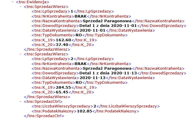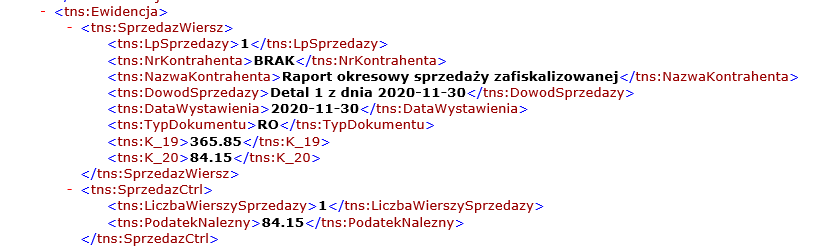 W przypadku kiedy paragony przenoszone są do rejestru VAT pojedynczymi zapisami (w Konfiguracji na zakładce Księgowość zaznaczony jest parametr ‘Księguj pojedyncze paragony’) podczas tworzenie pliku JPK_V7 powstaje techniczny zapis uwzględniający całość sprzedaży z pojedynczych paragonów. Co oznacza, iż dokumentowana jest podstawa opodatkowania i należny podatek od łącznej wartości sprzedaży, dla której wystawiano paragony fiskalne. Raport okresowy sprzedaży zafiskalizowanej zawiera następujące dane: Jeżeli parametr ‘Księguj pojedyncze paragony’ jest odznaczony, paragony są księgowane w zapisie zbiorczym, w obrębie danego dnia lub miesiąca. Zaksięgowanie paragonów generuje zbiorcze zapisy z podziałem na dokumenty zafiskalizowane i niezafiskalizowane oraz z zsumowanymi kwotami z podziałem na: stawkę VAT, rodzaj i kolumnę do księgowania. W części ewidencyjnej pliku JPK_V7 zbiorcze zapisy są wykazywane z osobna. Co oznacza, iż dokumentowana jest podstawa opodatkowania i należny podatek od każdego raportu zbiorczego oddzielnie. Korekta do paragonu prezentowana jest ze znacznikiem ,,RO”. Po zatwierdzeniu korekty do paragonu, w rejestrze VAT sprzedaży automatycznie powstaje zapis z kodem JPK_V7: RO. Kwota korekty (w przypadku zwrotów towarów lub oczywistych omyłek) do sprzedaży zaewidencjonowanej przy zastosowaniu kasy rejestrującej jest uwzględniana w raporcie okresowym sprzedaży zafiskalizowanej (zapis techniczny) – odpowiednio pomniejszonym. Zobacz więcej: