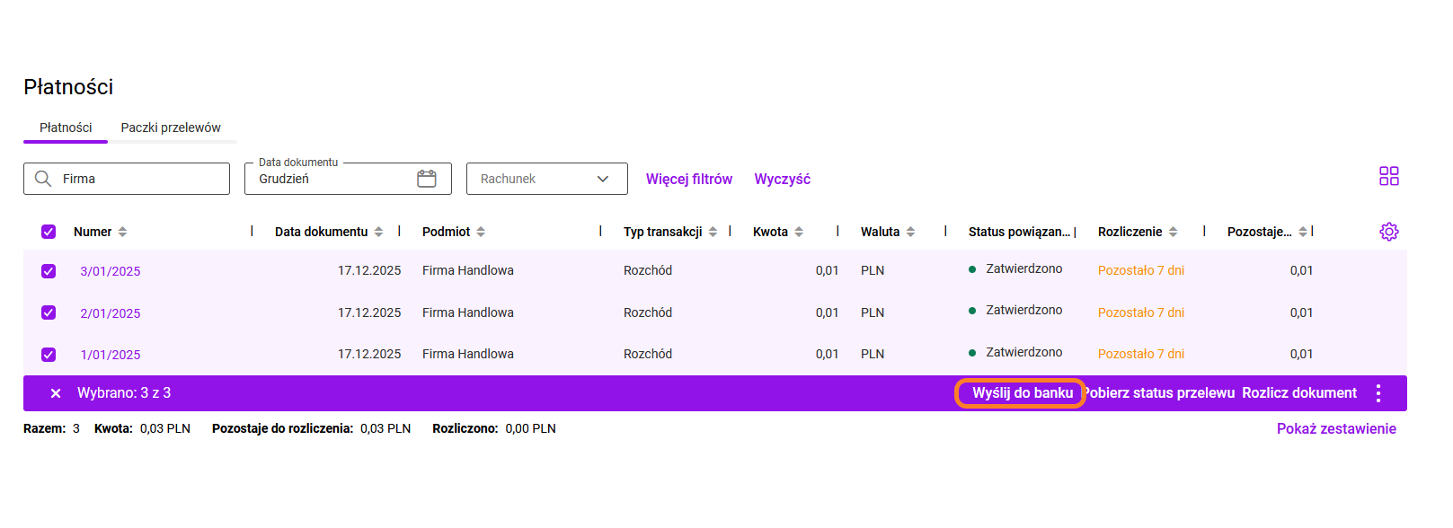 W programie istnieje również możliwość eksportu przelewów zbiorczych z poziomu listy płatności. Po zaznaczeniu kilku pozycji na liście należy wybrać: Wyślij do banku.