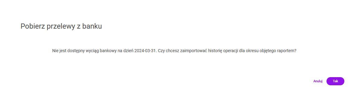Po wybraniu opcji: Tak, przelewy – za okres od daty otwarcia do daty zamknięcia raportu- zostaną zaczytane z systemu bankowego. Po wybraniu opcji: Anuluj import historii operacji zostanie przerwany.