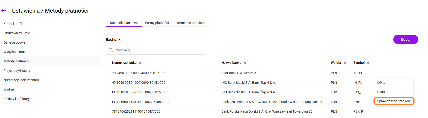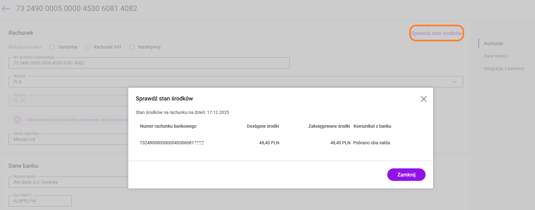 Odczytanie bieżącego salda na rachunku bankowym możliwe jest z poziomu listy rachunków bankowych oraz z formularza rachunku.