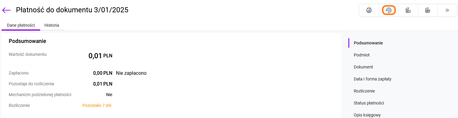 Opcja jest również dostępna z poziomu formularza płatności w prawym górnym menu jako: Pobierz status przelewu.
