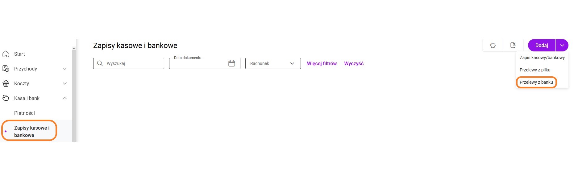 Opcja importu przelewów jest możliwa z poziomu listy zapisów kasowo/bankowych w rozwijanym menu na przycisku: Dodaj/ Przelewy z banku.