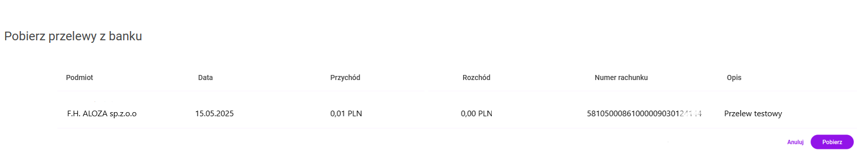 Po wybraniu przycisku: Dalej przelewy zostaną zaczytane z systemu bankowego i wyświetlone. Użytkownik może teraz sprawdzić czy wszystkie dane są poprawne. Program pokazuje nazwę podmiotu, datę, wartość wpłaty oraz wypłaty, numer rachunku bankowego odczytany z systemu bankowego oraz opis.