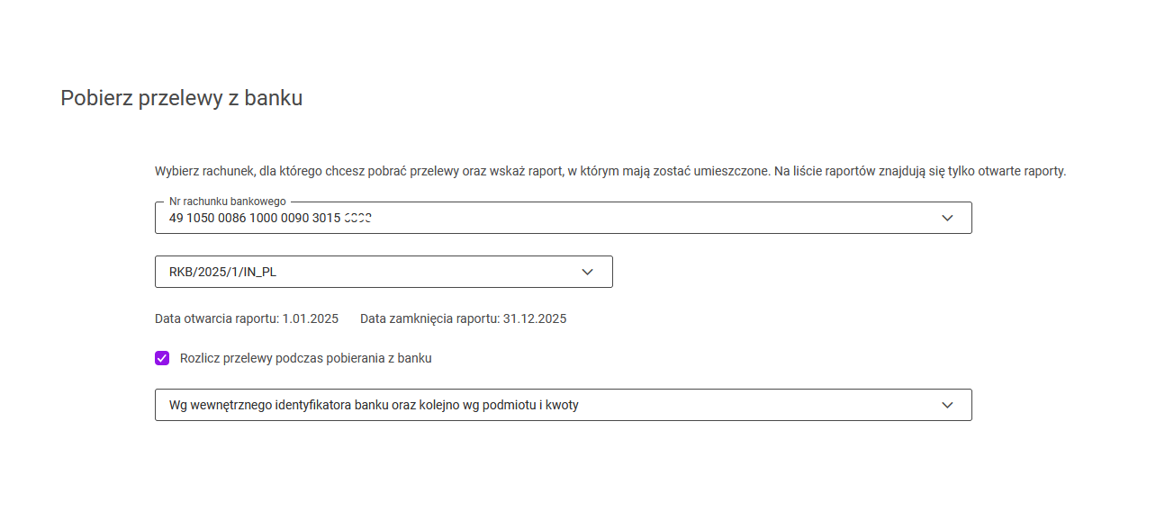 Po wybraniu opcji: Przelewy z banku pojawi się okno, na którym należy wybrać rachunek bankowy, oraz wskazać raport, w którym przelewy mają zostać umieszczone.
