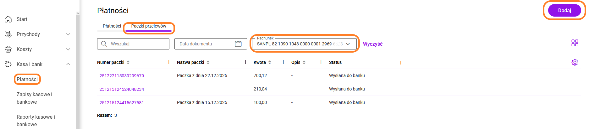 Za pomocą przycisku: Dodaj – dodajemy płatności, które mają być wyeksportowane do iBiznes24 w danej paczce. Program wyświetla listę płatności dla wybranego rachunku, które nie zostały wysłane do iBiznes24 i nie zostały dodane do innej paczki.