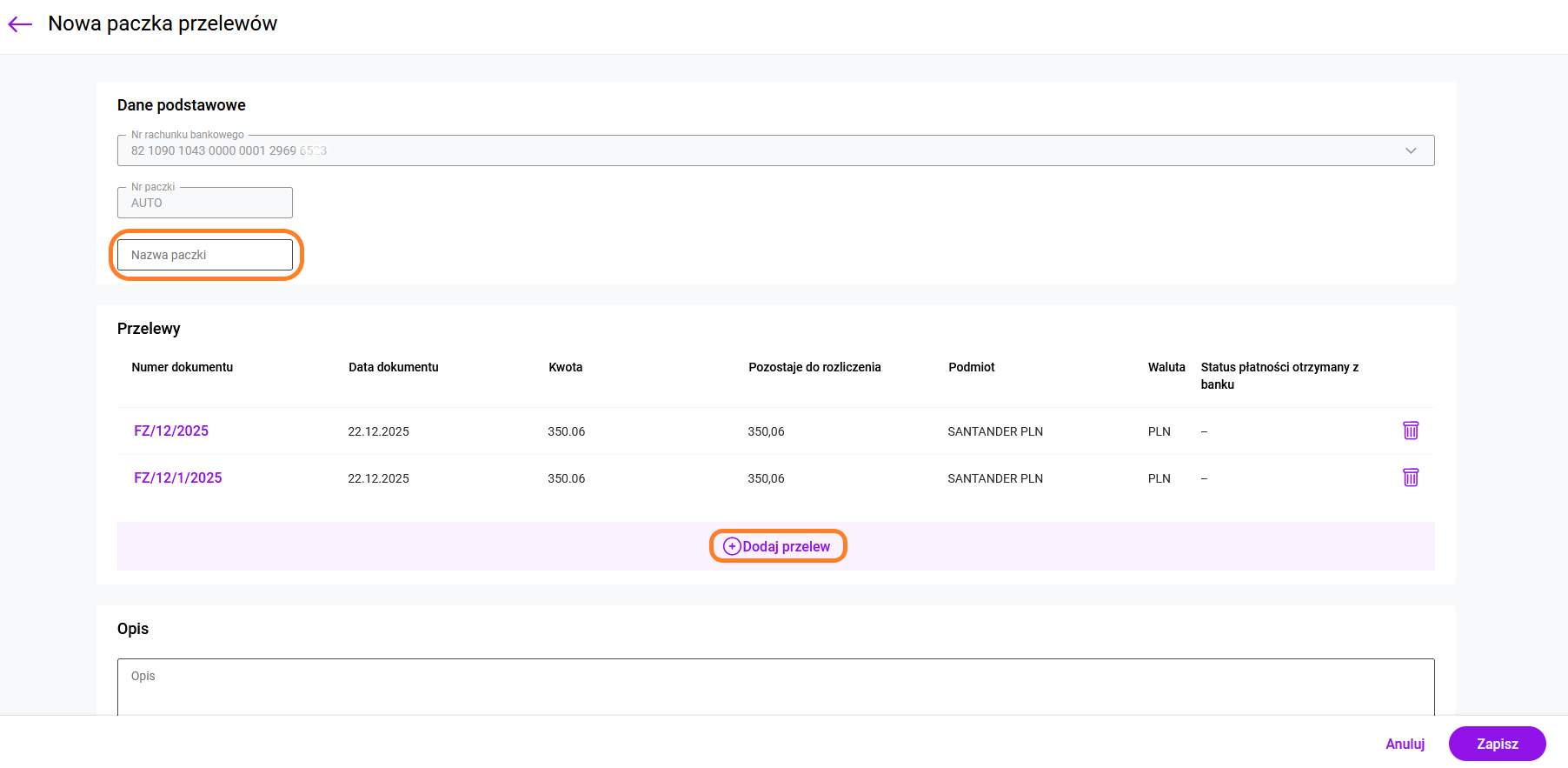 W celu dodania nowej paczki na liście paczek w filtrze Rachunek należy wybrać rachunek bankowy posiadający usługę iBiznes24, z którego chcemy wysyłać daną paczkę przelewów. Dodając nową paczkę możemy podać jej nazwę oraz opis. Unikalny numer paczki nadawany jest automatycznie w momencie zapisu paczki.