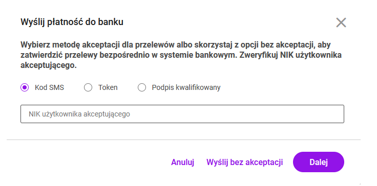 Po wybraniu przycisku: Dalej, w kolejnym oknie możemy wybrać metodę akceptacji dla przelewów. Do wyboru jest akceptacja za pomocą kodu SMS, tokena, podpisu kwalifikowanego. Można też skorzystać z opcji bez akceptacji, aby zatwierdzić przelewy bezpośrednio w systemie bankowym. Po wybraniu przycisku: Anuluj wysyłanie przelewów zostanie przerwane.