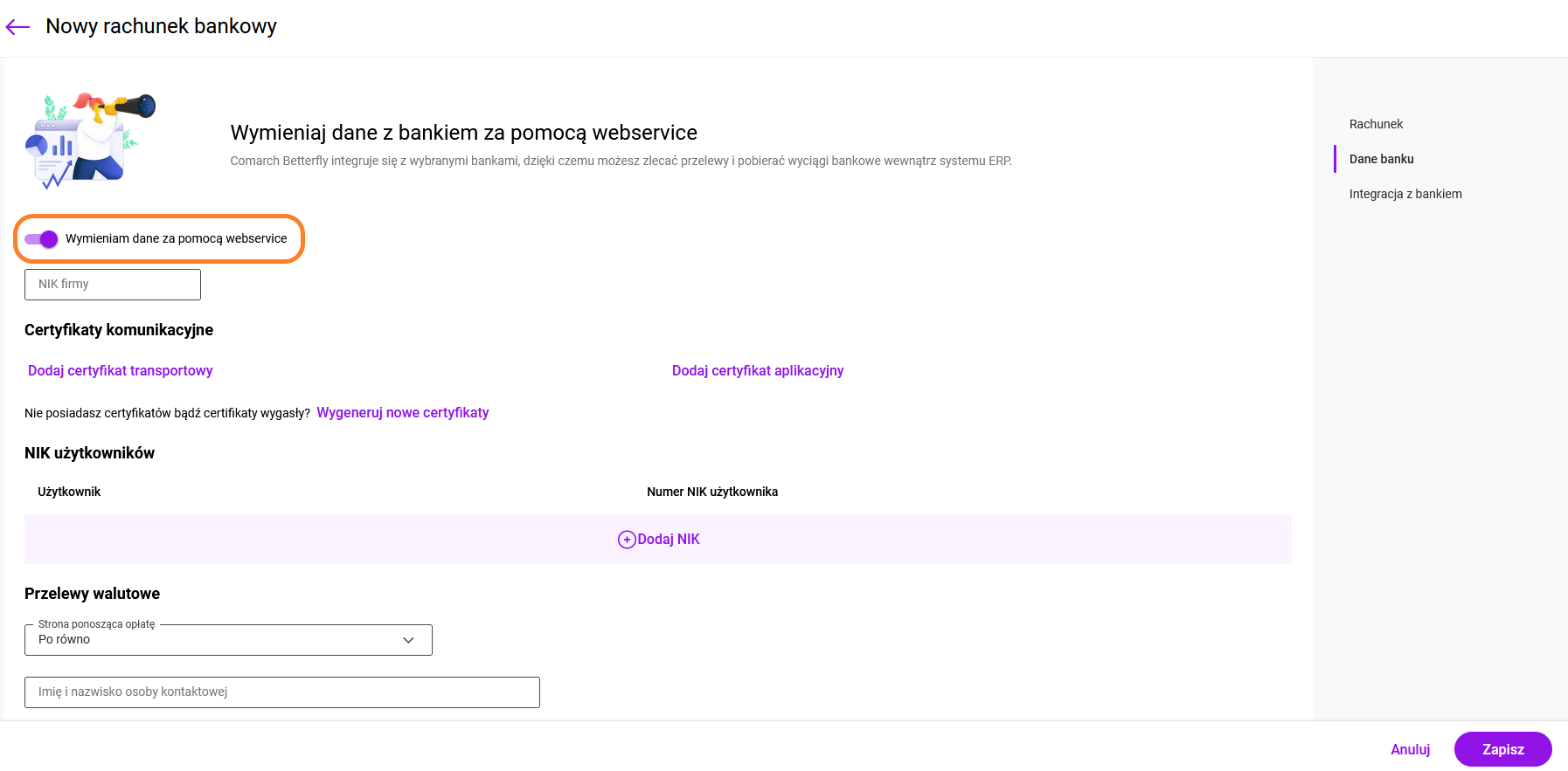 Odpowiedź: na formularzu rachunku bankowego, w sekcji: Integracja z bankiem należy zaznaczyć parametr: Wymieniam dane za pomocą websevice oraz uzupełnić NIK Firmy, NIK Użytkownika, podpiąć certyfikat transportowy i aplikacyjny oraz dla przelewów walutowych wskazać, kto ponosi opłaty.