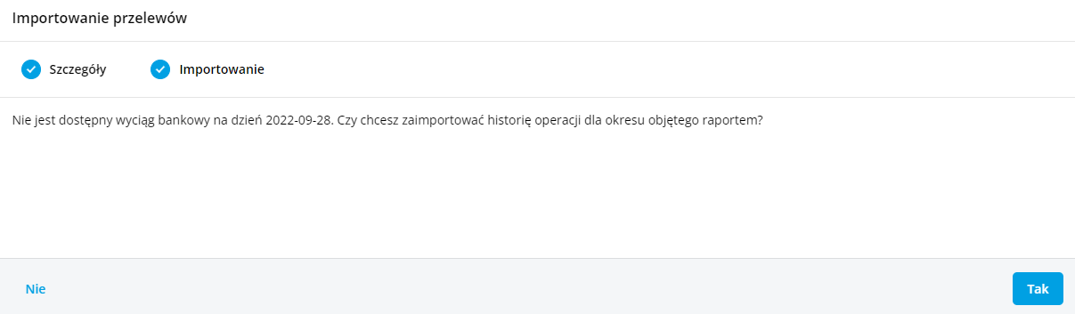 Po wybraniu opcji „Tak” przelewy – za okres od daty otwarcia do daty zamknięcia raportu- zostaną zaczytane z systemu bankowego. Po wybraniu opcji „Nie” import historii operacji zostanie przerwany.