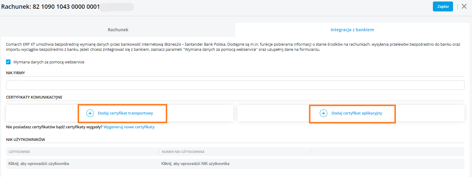 Odpowiedź: na formularzu rachunku bankowego, na zakładce Integracja z bankiem należy zaznaczyć parametr „Wymiana danych za pomocą websevice” oraz uzupełnić NIK Firmy, NIK Użytkownika, podpiąć certyfikat transportowy i aplikacyjny oraz dla przelewów walutowych wskazać, kto ponosi opłaty.