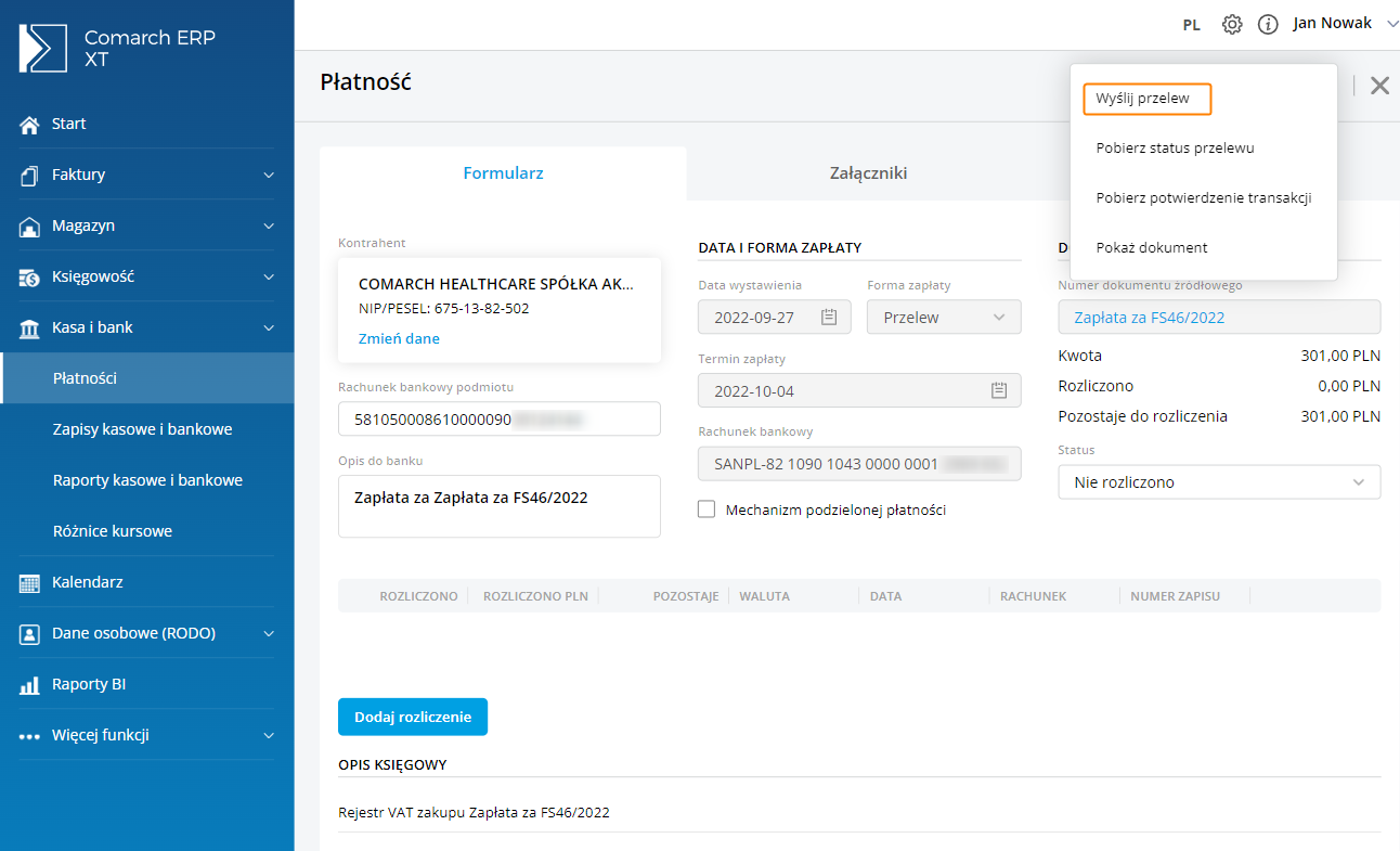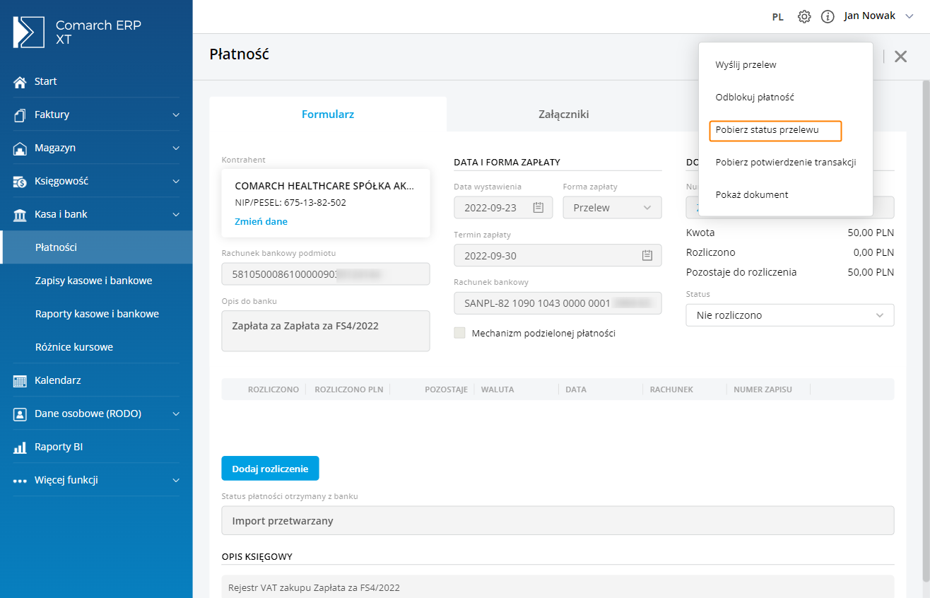 Opcja jest również dostępna z poziomu formularza płatności w menu kontekstowym jako Pobierz status przelewu.