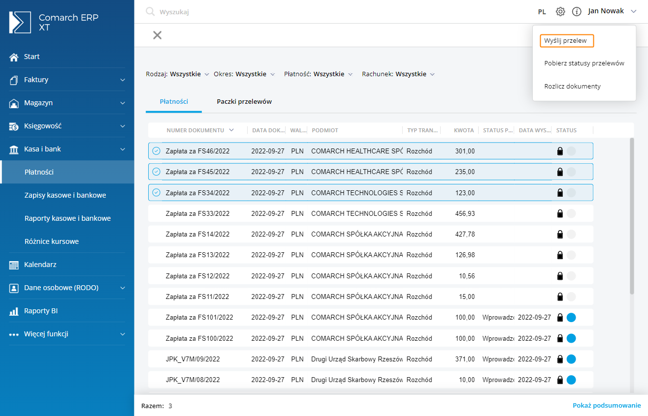W programie istnieje również możliwość wysyłki przelewów zbiorczych z poziomu listy płatności. Po zaznaczeniu wielu pozycji na liście płatności w menu kontekstowym należy wybrać opcję Wyślij przelew.