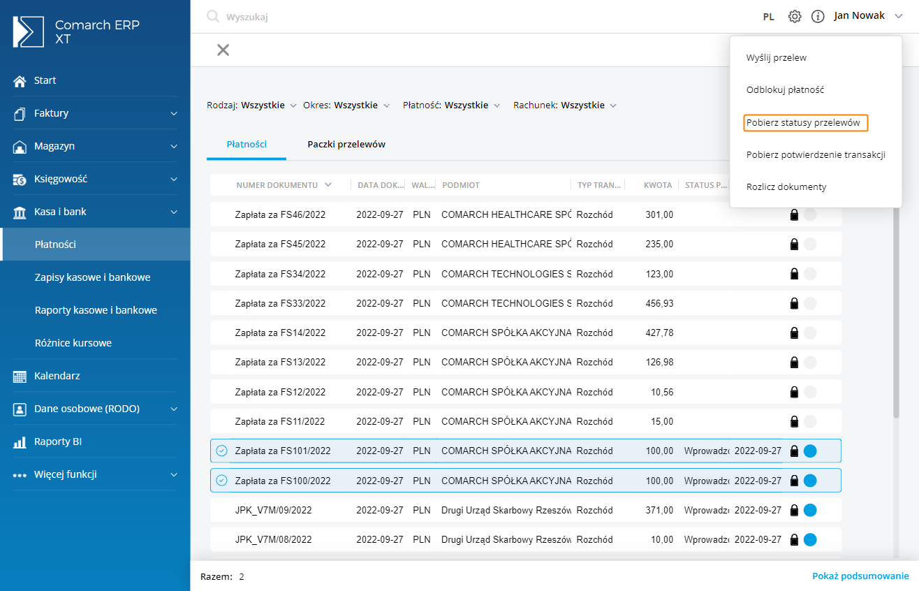 Opcja pobierania statusu przelewów jest dostępna z poziomu listy płatności. Po zaznaczeniu płatności na liście z menu kontekstowego należy wybrać opcję Pobierz statusy przelewów. Opcja Pobierz statusy przelewów sprawdza stan przelewów w banku oraz aktualizuje informacje na liście płatności oraz na formularzu płatności.