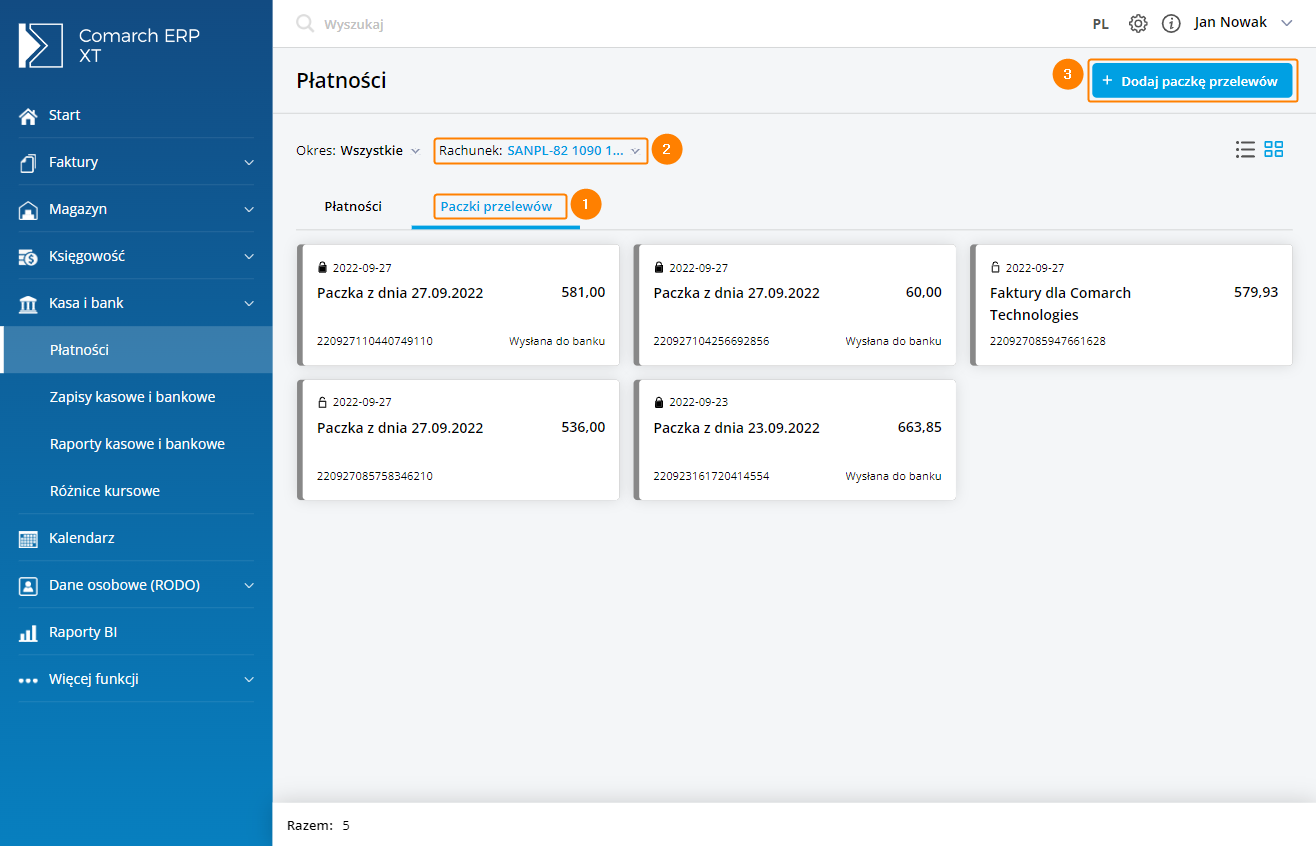W momencie wysyłki przelewów program utworzy z nich paczkę przelewów. W paczce znajdą się przelewy, które wcześniej nie zostały wyeksportowane, nie zostały dodane do innej paczki, mają uzupełniony opis do banku, adres beneficjenta oraz uzupełniony jego numer rachunku bankowego. Paczka uzyska unikalny numer oraz domyślną nazwę Paczka z dnia DD.MM.RRRR, gdzie DD.MM.RRRR to data wykonania eksportu do iBiznes24.