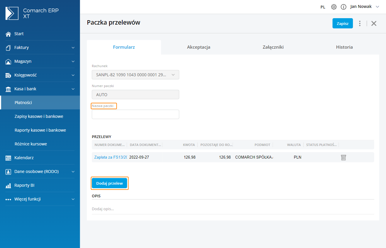 Z listy oraz formularza płatności możemy również pobrać w formie pliku pdf potwierdzenia wykonania przelewu. Opcja Pobierz potwierdzenie transakcji dostępna jest w menu kontekstowym. Potwierdzenie przelewu jest zapisywane dla konkretnej płatności w zakładce Załączniki.
