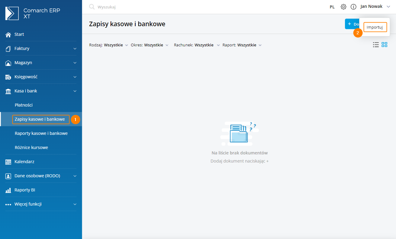 Opcja importu jest dostępna na liście zapisów kasowych/bankowych w menu kontekstowym: