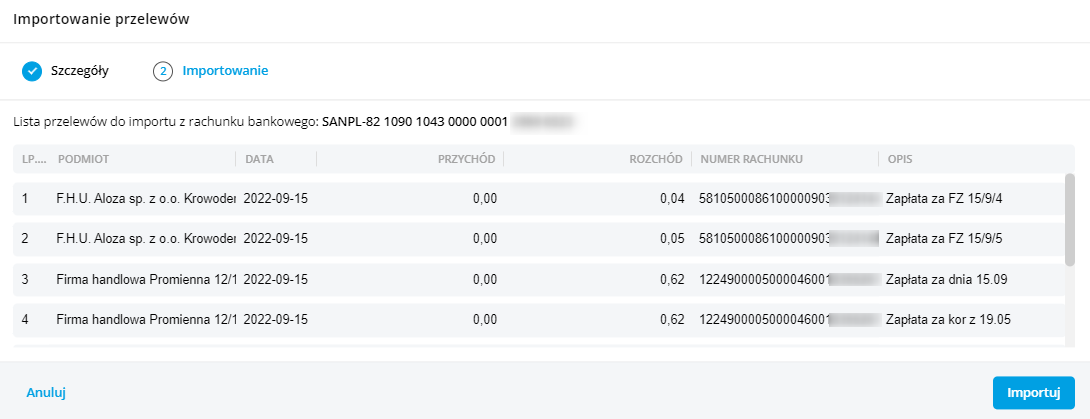 Wybór przycisku Importuj powoduje zapisanie przelewów na liście zapisów kasowych/bankowych. Aby przelewy zaimportowały się poprawnie, w programie musi być otwarty raport bankowy na dzień przelewu. Dodatkowo program sprawdza czy taki przelew nie został już wcześniej zaimportowany. Po wybraniu przycisku Anuluj import przelewów zostanie przerwany, a okno importu zostanie zamknięte. Przycisk Powrót przenosi widok Użytkownika na poprzednie okno konfiguracji importu.