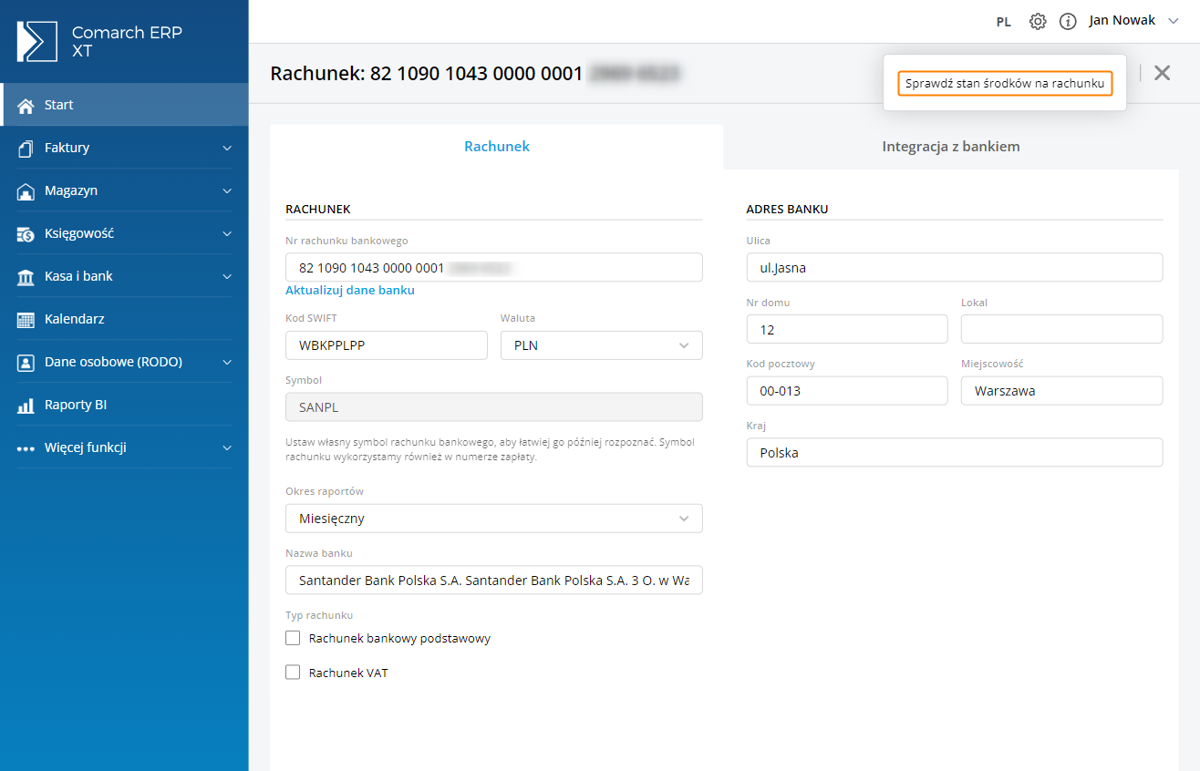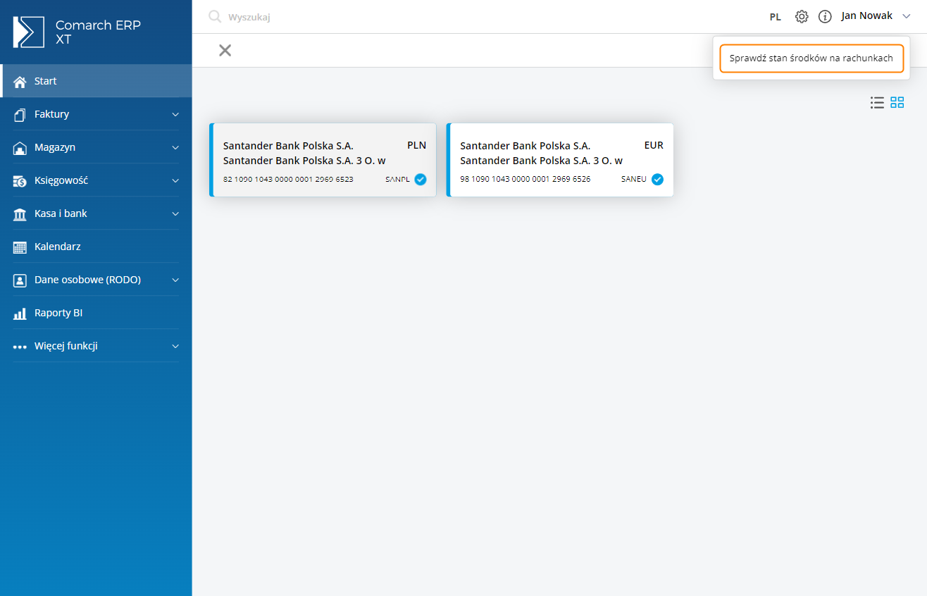 Odczytanie bieżącego salda na rachunku bankowym możliwe jest z poziomu listy rachunków bankowych oraz z formularza rachunku.