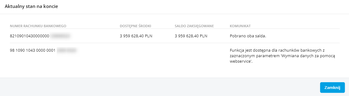Dla rachunków bankowych, które nie mają skonfigurowanej wymiany danych za pomocą webservice podczas odczytywania bieżącego salda na rachunku pojawi się komunikat: