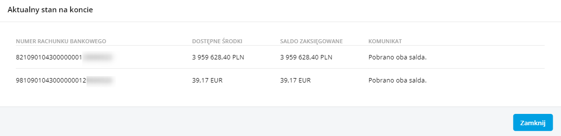 Po wybraniu opcji Sprawdź stan środków na rachunku zostaną odczytane dwa salda: Dostępne środki i Saldo zaksięgowane. Po pobraniu sald zostanie wyświetlone okno o tytule Aktualny stan na koncie, a w nim informacje o numerze rachunku bankowego, dostępne środki, saldo zaksięgowane oraz odpowiedni komunikat otrzymany z systemu bankowego.